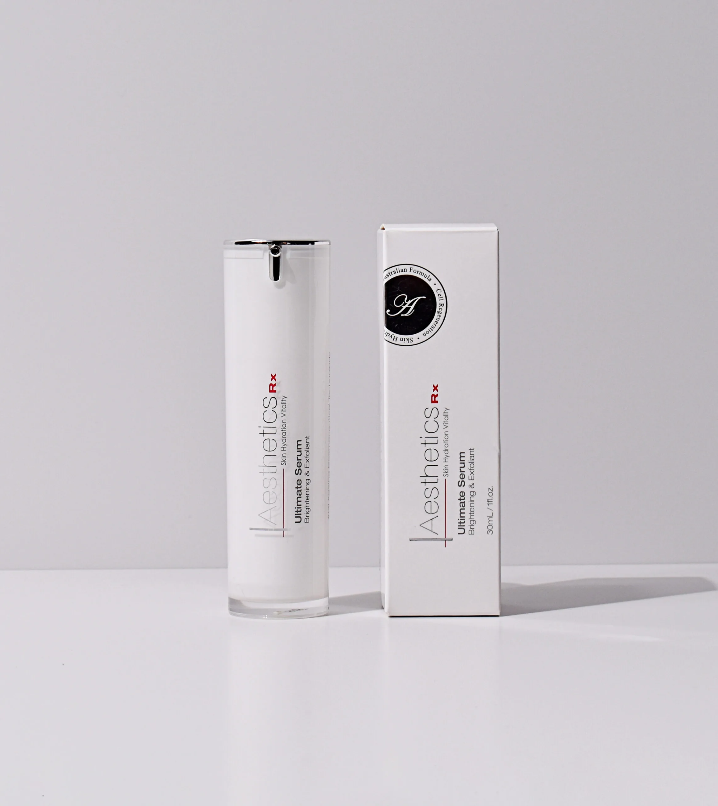The Aesthetics Rx® four-step system: Ultimate Serum, Vitamin C Serum, Everbright Day & Night Cream, and Ultra-Protection Sunscreen SPF50+ all work together to visibly improve uneven tone, gently and effectively.